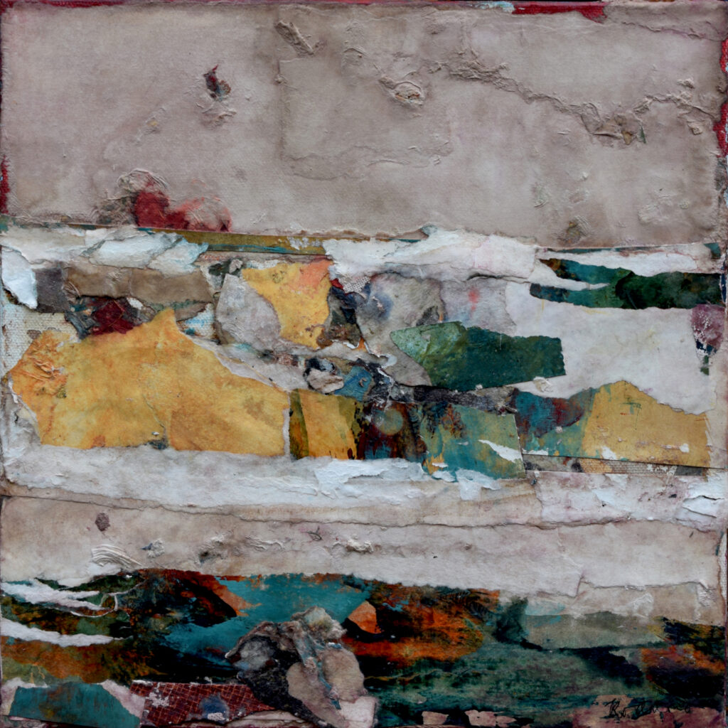 Watercolour, acrylic and paper pulp bonded to canvas. 20 X 20 cm. £495 framed