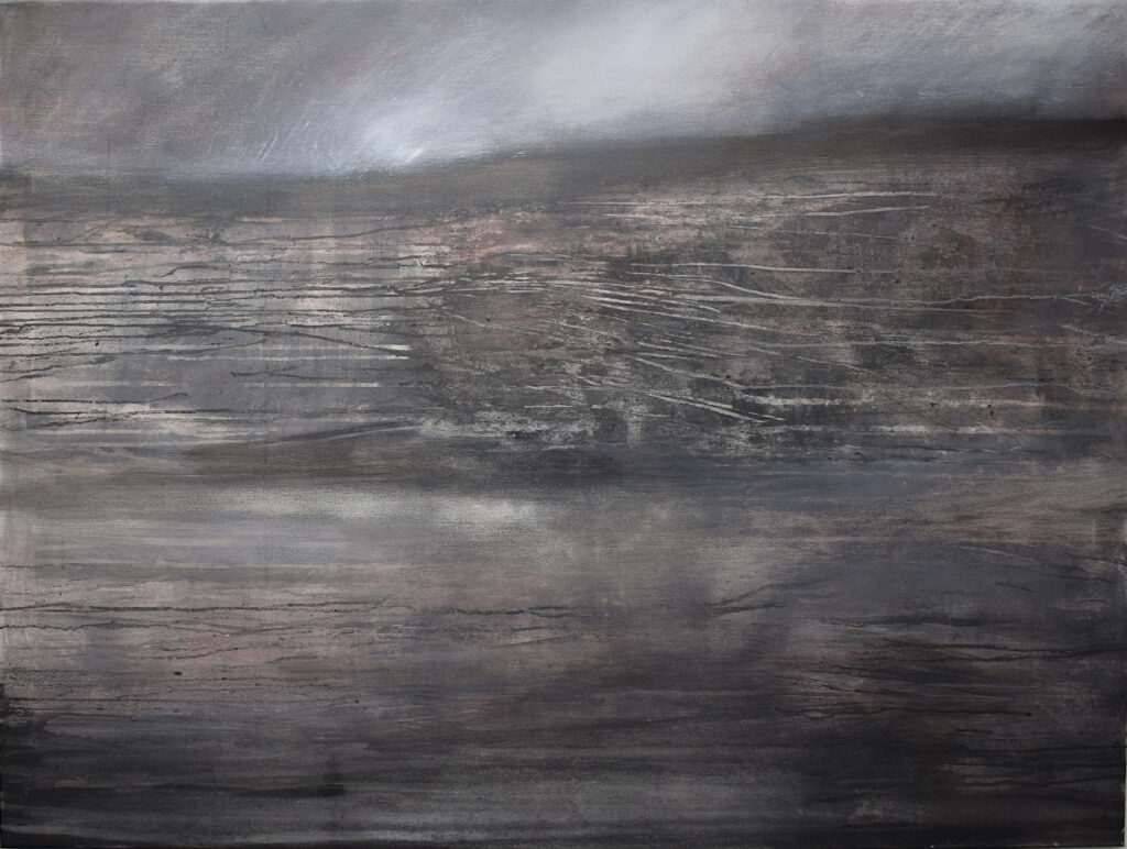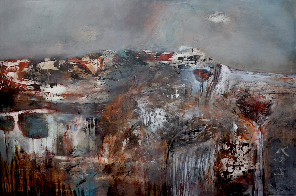 Watercolour, paper pulp, walnut ink stain, acrylic on canvas. 100 x 70 cm